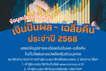 สมาชิกรับทราบยอดเงินปันผล - เฉลี่ยคืน ประจำปี 2568 ผ่านช่องทาง ดังนี้ 1. ผ่านระบบสมาชิก CMC...