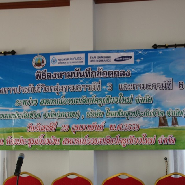 วันที่ 29 กุมภาพันธ์ 2559 สหกรณ์ออมทรัพย์ครูเชียงใหม่ จำกัด นำโดย นายธนู มีสัตย์ ประธานกรรมการดำเนินการและคณะ เข้าร่วมพิธีการลงนามบันทึกข้อตกลงโครงการประกันชีวิตกลุ่มกรมธรรม์ที่ 3 และ กรมธรรม์ที่ 6 ระหว่างสหกรณ์ออมทรัพย์ครูเชียงใหม่ จำกัด กับบริษัทกรุงเทพประกันชีวิต จำกัด (มหาชน) และบริษัทไทยซัมซุงประกันชีวิต จำกัด (มหาชน)