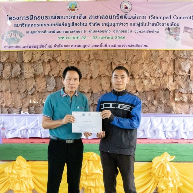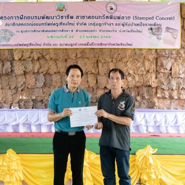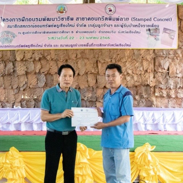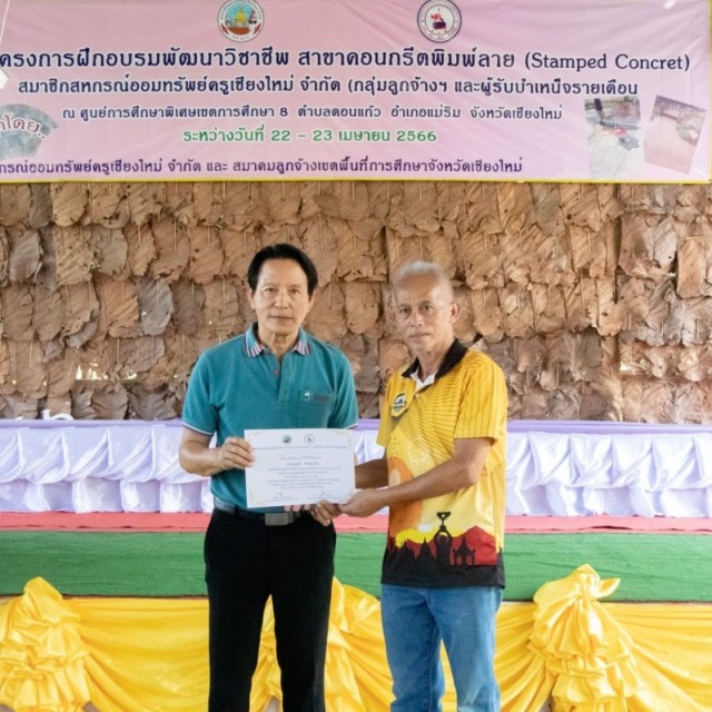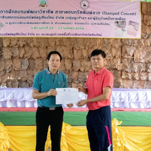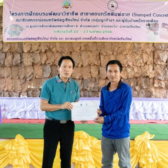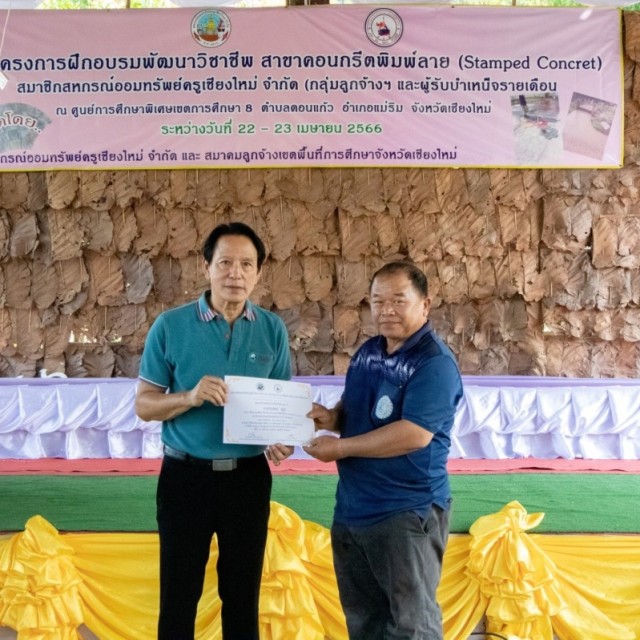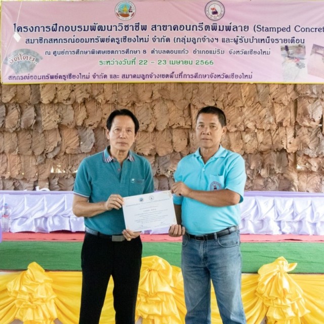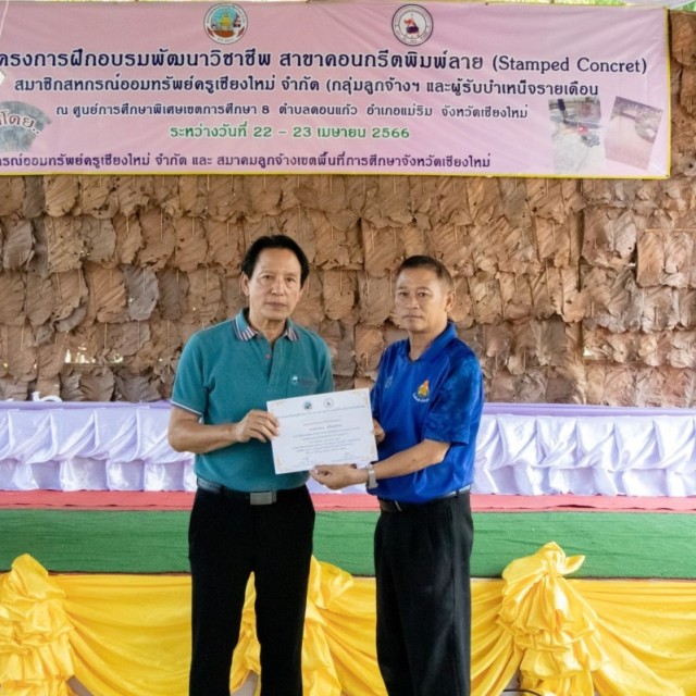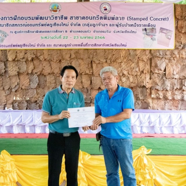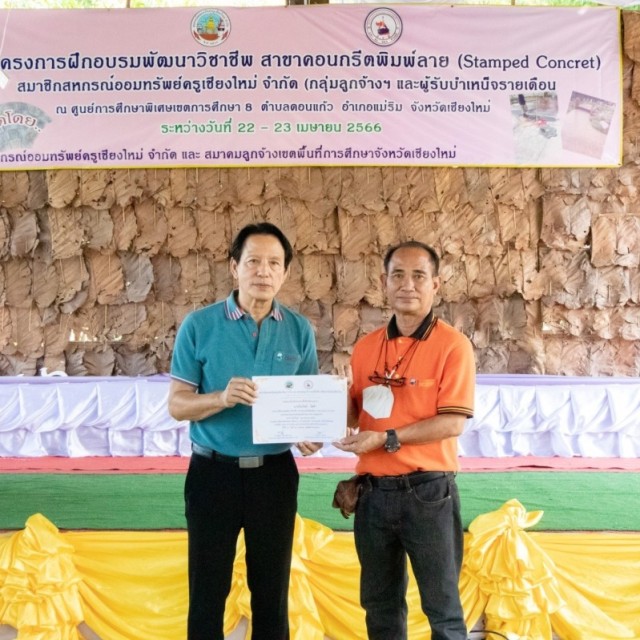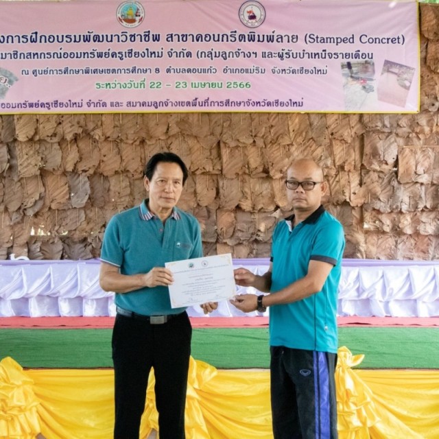 นายสุทัศน์ ประสาธน์สุวรรณ์ ประธานกรรมการ สหกรณ์ออมทรัพย์ครูเชียงใหม่ จำกัด เป็นประธานในพิธีเปิดโครงการอบรมพัฒนาวิชาชีพสหกรณ์ออมทรัพย์ครูเชียงใหม่ จำกัด กลุ่มลูกจ้างประจำและผู้รับบำเหน็จรายเดือน ประจำปี 2566 หลักสูตร "งานคอนกรีตพิมพ์ลาย (Stamped Concrete)" ระหว่างวันที่ 22-23 เมษายน 2566 ณ ศูนย์การศึกษาพิเศษเขตการศึกษา 8 อำเภอแม่ริม จังหวัดเชียงใหม่ โดยมีวัตถุประสงค์เพื่อให้สมาชิกผู้เข้ารับการฝึกอบรมได้นำความรู้ที่ได้รับนำไปปฏิบัติเป็นอาชีพเสริม เพิ่มรายได้ให้แก่ตนเองและครอบครัว โดยสหกรณ์ฯ ได้สนับสนุนงบประมาณในการดำเนินงานตามโครงการฝึกอบรมวิชาชีพเสริมแก่สมาชิกกลุ่มลูกจ้างประจำในครั้งนี้ เป็นเงินจำนวน 100,000 บาท