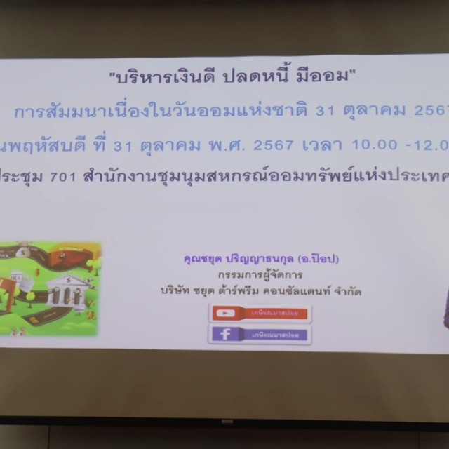 นายสุทัศน์ ประสาธน์สุวรรณ์ ประธานกรรมการ สหกรณ์ออมทรัพย์ครูเชียงใหม่ จำกัด เข้าร่วมงาน “วันออมแห่งชาติ ประจำปี 2567” พร้อมรับฟังบรรยาย หัวข้อ "บริหารเงินดี ปลดหนี้ มีออม” โดย อาจารย์ชยุต ปริญญาธนกุล วิทยากรผู้ทรงคุณวุฒิ ตลาดหลักทรัพย์แห่งประเทศไทย เมื่อ 31 ตุลาคม 2567 ณ ชุมนุมสหกรณ์ออมทรัพย์แห่งประเทศไทย จำกัด จังหวัดนนทบุรี