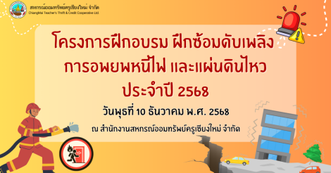 เเละปฏิบัติตามกฎกระทรวงกำหนดมาตรฐานในการบริหาร จัดการ และดำเนินการด้านความปลอดภัย อาชีวอนามัย และสภาพแวดล้อมในการทำงานเกี่ยวกับการป้องกันและระงับอัคคีภัย พ.ศ. 2555 โดยวิทยากรมืออาชีพจากเจ้าหน้าที่งานป้องกันและบรรเทาสาธารณภัย เทศบาลตำบลยางเนิ้ง ณ ห้องประชุมเอื้องเงิน ชั้น 2 สำนักงานสหกรณ์ออมทรัพย์ครูเชียงใหม่ จำกัด
