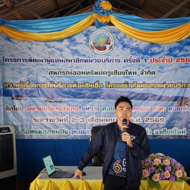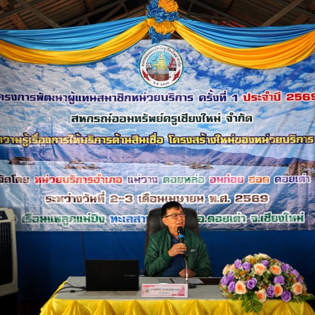 นายสุทัศน์ ประสาธน์สุวรรณ์ ประธานกรรมการ สหกรณ์ออมทรัพย์ครูเชียงใหม่ จำกัด เป็นประธานในพิธีเปิดโครงการพัฒนาผู้แทนสมาชิกหน่วยบริการ ครั้งที่ 1 ประจำปี 2569 ของหน่วยบริการอ.เเม่วาง อ.ดอยหล่อ อ.อมก๋อย อ.ฮอด อ.ดอยเต่า จัดกิจกรรมระหว่างวันที่ 2 - 3 เมษายน 2569 ณ ทะเลสาบดอยเต่า อ.ดอยเต่า จ.เชียงใหม่ โดยคุณณัฐวุฒิ นาคะเปรมินทร์ เเละคุณอชิตพล มุขแก้ว เป็นวิทยากรบรรยายในหัวข้อ "การให้บริการสินเชื่อเเละโครงสร้างใหม่ของหน่วยบริการ"