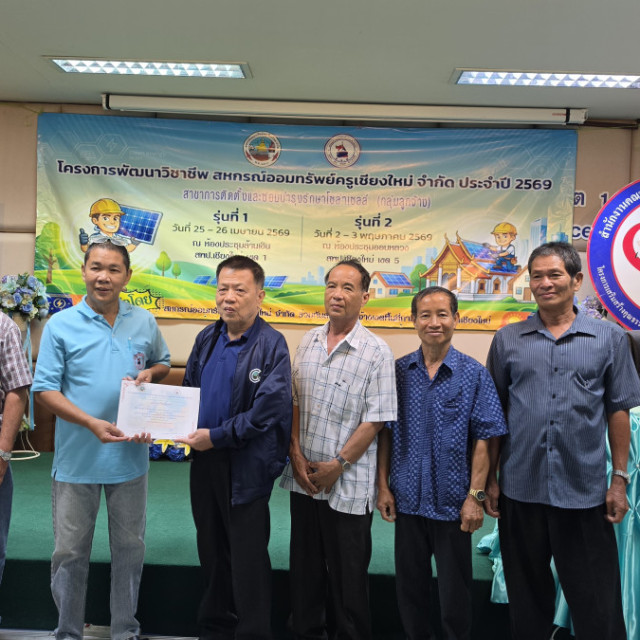 นายสมยงค์ คำอ้าย รองประธานกรรมการคนที่ 2 เป็นประธานในพิธีเปิด โครงการฝึกอบรมวิชาชีพ ประจำปี 2569 (กลุ่มสมาชิกพนักงานบริการและลูกจ้างประจำ) หลักสูตร “การติดตั้งและซ่อมบำรุงโซล่าเซลล์” รุ่นที่ 1 โดยนายเชิดชัย ทิพยวารีวงค์ ประธานกรรมการการศึกษากล่าวรายงาน กิจกรรมดังกล่าวจัดขึ้นระหว่างวันที่ 25-26 เมษายน พ.ศ. 2569 ณ ห้องประชุม สำนักงานเขตพื้นที่การศึกษาประถมศึกษาเชียงใหม่ เขต 1 อำเภอเมือง จังหวัดเชียงใหม่