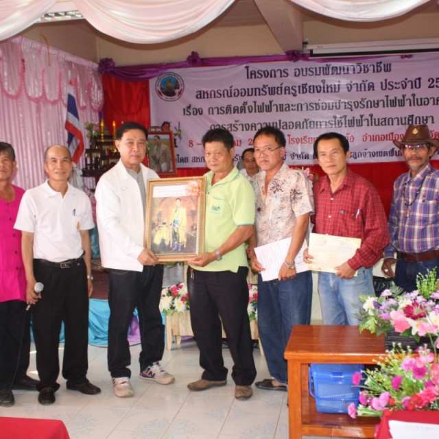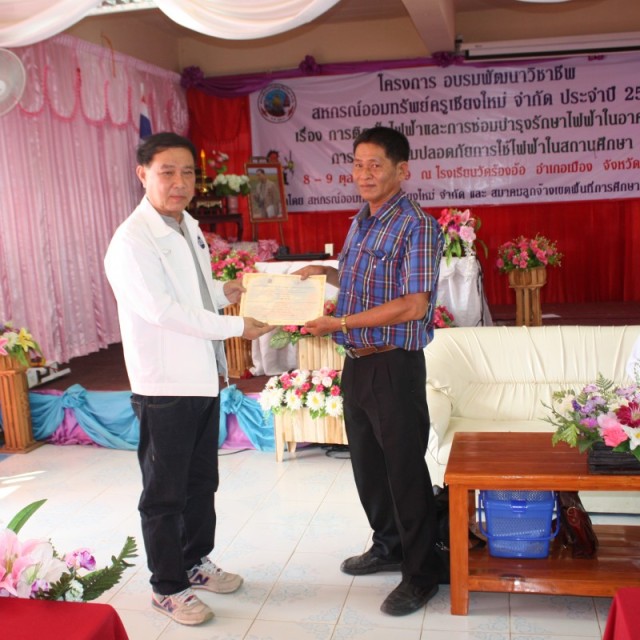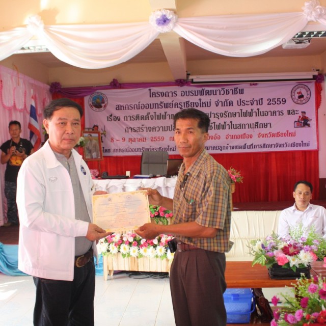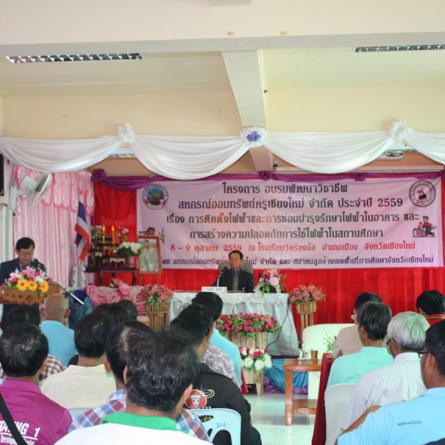 เมื่อวันที่ 8 – 9 ตุลาคม 2559 สหกรณ์ออมทรัพย์ครูเชียงใหม่ จำกัด ได้จัด โครงการฝึกอบรมวิชาชีพลูกจ้างประจำเขตพื้นที่การศึกษาจังหวัดเชียงใหม่ หลักสูตร “การติดตั้ง การซ่อม การบำรุงรักษาและการสร้างความปลอดภัยการใช้ไฟฟ้าในอาคารในสถานศึกษา” ณ โรงเรียนวัดร้องอ้อ อำเภอเมือง จังหวัดเชียงใหม่ โดยมีนายธนู มีสัตย์ ประธานกรรมการให้เกียรติมอบวุฒิบัตรแก่ผู้เข้าอบรม โดยมีสมาชิกสหกรณ์ฯ เข้ารับการฝึกอบรม จำนวนกว่า 250 คน