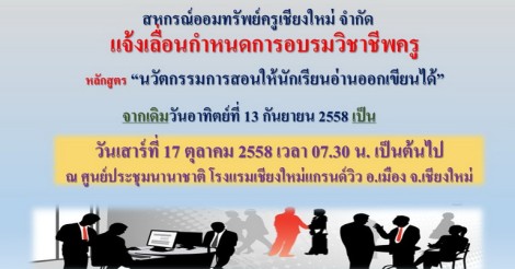 สหกรณ์ออมทรัพย์ครูเชียงใหม่ จำกัด ขอแจ้งประชาสัมพันธ์ การเลื่อนกำหนดการอบรมวิชาชีพครู หลักสูตร "นวัตกรรมการสอนให้นักเรียนอ่านออกเขียนได้" จากเดิมวันอาทิตย์ที่ 13 กันยายน 2558 เป็นวันเสาร์ที่ 17 ตุลาคม 2558 เวลา 07.30 เป็นต้นไป ณ ศูนย์ประชุมนานาชาติ โรงแรมเชียงใหม่แกรนด์วิว อ.เมือง จ.เชียงใหม่