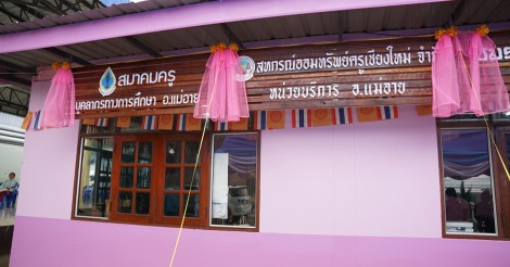 นายสิทธิศักดิ์ อภิกุลชัยสุทธิ์ นายอำเภอแม่อาย นายสุทัศน์ ประสาธน์สุวรรณ์ ประธานกรรมการ สหกรณ์ออมทรัพย์ครูเชียงใหม่ จำกัด และนายสมนึก อินหวัน นายกสมาคมครูและบุคลากรทางการศึกษาอำเภอแม่อาย ได้ทำพิธีเปิดผ้าแพรคลุมป้ายร่วมกัน