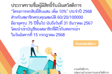 บัญชีรายชื่อผู้มีสิทธิ์รับเงินสวัสดิการ "โครงการหกสิบยี่สิบแสน เพิ่ม 10%" ประจำปี 2568 สำหรับสมาชิกครบคุณสมบัติ ...