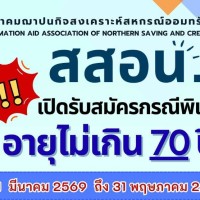 สมาคมฌาปนกิจสงเคราะห์สหกรณ์ออมทรัพย์ภาคเหนือ (สสอน.) เปิดรับสมัครสมาชิกกรณีพิเศษอายุไม่เกิน 70 ปี ตั้งเเต่วันที่ 1 มีนาคม - 31 พฤษภาคม 2569