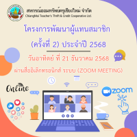 ขอเชิญผู้แทนสมาชิกเข้าร่วมโครงการพัฒนาผู้แทนสมาชิก ครั้งที่ 2 ประจำปี 2568 ผ่านสื่ออิเล็กทรอนิกส์ (ระบบZoom Meeting)