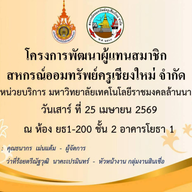 วันเสาร์ที่ 25 เมษายน 2569 หน่วยบริการ ม.เทคโนโลยีราชมงคลล้านนา กำหนดจัดโครงการพัฒนาผู้แทนสมาชิกหน่วยบริการ ครั้งที่ 1 ประจำปี 2569 ผู้แทนสมาชิกเข้าร่วมจำนวน 26 คน เพื่อให้ผู้เเทนสมาชิกเกิดความรู้ ความเข้าใจในบทบาทหน้าที่เเละความรับผิดชอบของผู้เเทนสมาชิก พัฒนาความสามารถในการทำหน้าที่ของผู้เเทนสมาชิก โดยมีคุณเกรียงไกร ธารพรศรี กรรมการเงินกู้ คุณธนากร เม่นเเต้ม ผู้จัดการ เเละคุณณัฐวุฒิ นาคะเปรมินทร์ หัวหน้างาน กลุ่มงานสินเชื่อ เป็นวิทยากร ณ อาคารสาขาวิศวกรรมโยธา มหาวิทยาลัยเทคโนโลยีราชมงคลล้านา