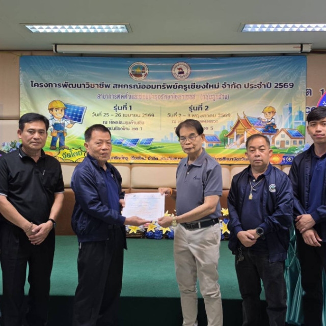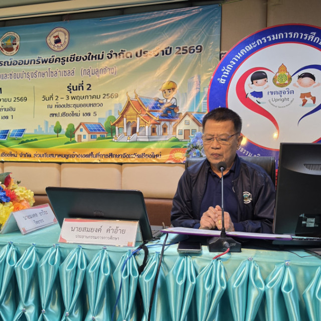 นายสมยงค์ คำอ้าย รองประธานกรรมการคนที่ 2 เป็นประธานในพิธีเปิด โครงการฝึกอบรมวิชาชีพ ประจำปี 2569 (กลุ่มสมาชิกพนักงานบริการและลูกจ้างประจำ) หลักสูตร “การติดตั้งและซ่อมบำรุงโซล่าเซลล์” รุ่นที่ 1 โดยนายเชิดชัย ทิพยวารีวงค์ ประธานกรรมการการศึกษากล่าวรายงาน กิจกรรมดังกล่าวจัดขึ้นระหว่างวันที่ 25-26 เมษายน พ.ศ. 2569 ณ ห้องประชุม สำนักงานเขตพื้นที่การศึกษาประถมศึกษาเชียงใหม่ เขต 1 อำเภอเมือง จังหวัดเชียงใหม่